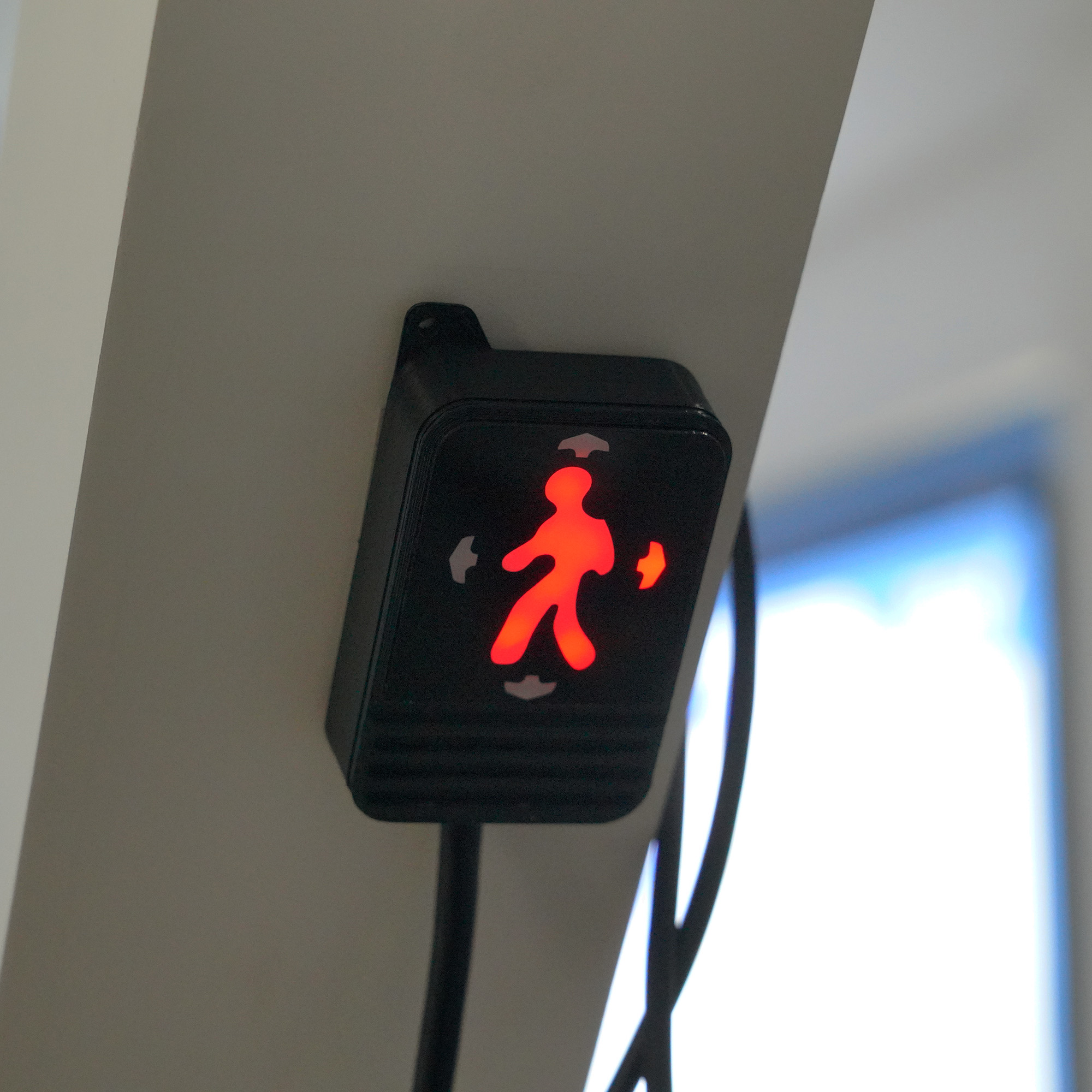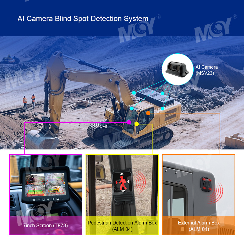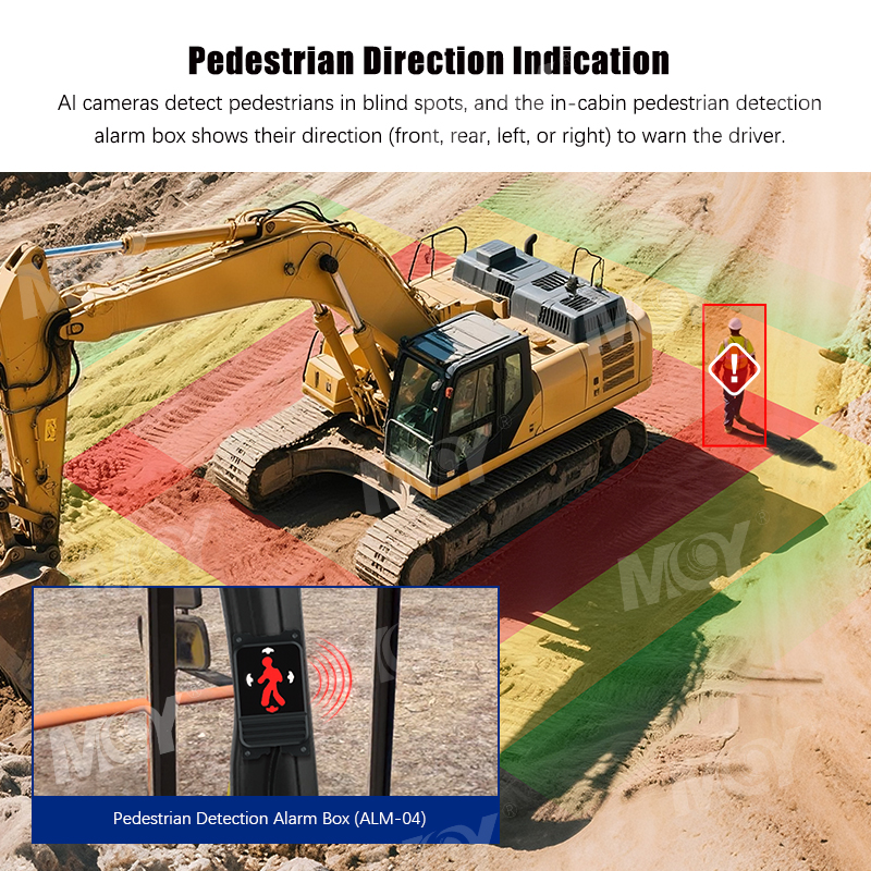 The AI cameras around the construction vehicle detect workers on site in blind spots, and the in-cabin pedestrian detection alarm box shows ther direction (front, rear, left or right) to warn the driver