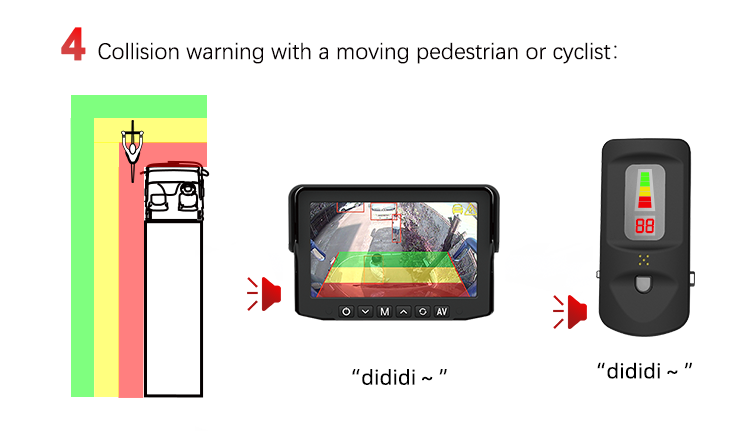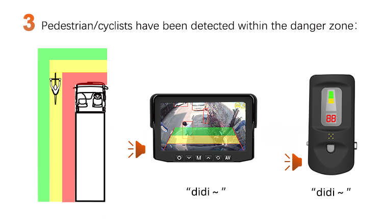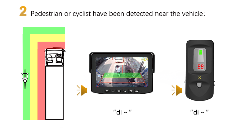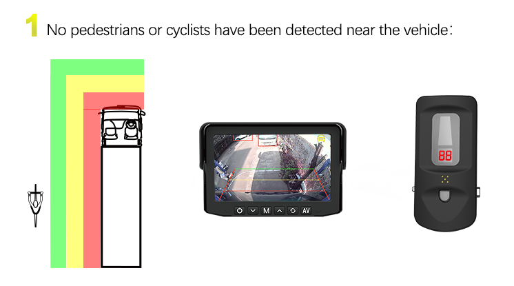 When pedestrians or non-motorized vehicles are in the green area of the left AI blind spot, the LED of the alarm box lights up in green. In the yellow area, the LED shows yellow, an in the red area, the LED indicates red.If the buzzer is selected, it will produce a “di” sound (in the green area), “didi” sound (in the yellow area), or “dididi” sound (in the red area). Sound alarms will occur simultaneously with the LED display.